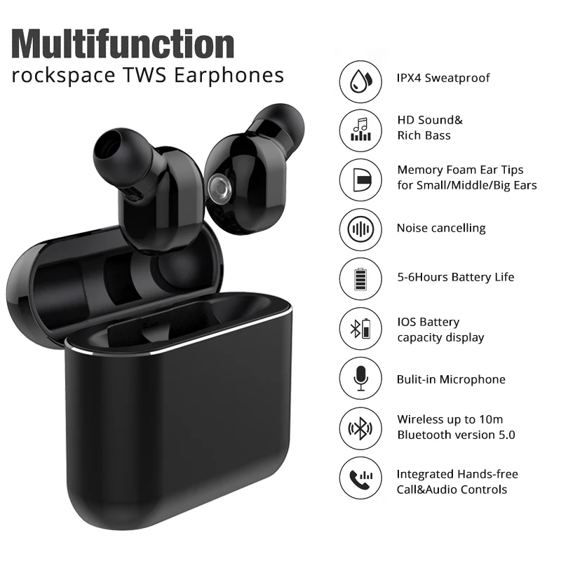 ROCKSPACE TWS Wireless Earbuds V5.0 Bluetooth Earphone Headset Deep Bass Stereo 3D Sound SweatProof Sports Earphones Headset